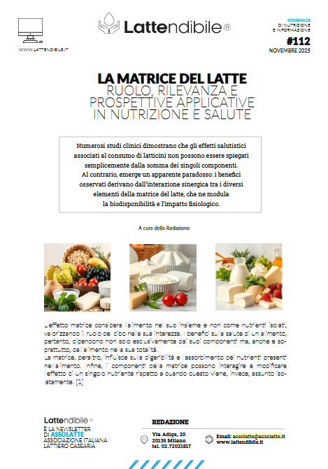 Queste risultanze, che contrastano con le aspettative basate sull’analisi dei singoli componenti e valorizzano l’effetto matrice, sono l’oggetto del nuovo numero de Lattendibile, il giornale nutrizionale di Assolatte, LA MATRICE DEL LATTE: RUOLO, RILEVANZA E PROSPETTIVE APPLICATIVE IN NUTRIZIONE E SALUTE.